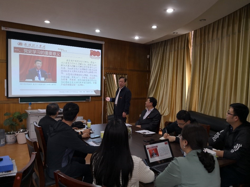 史政海同志从党史学习的重要意义、中国共产党简史、党的百年发展与辉煌三个方面讲述了中国共产党领导中国人民开天辟地完成救国大业、改天换地开启兴国大业、翻天覆地推进富国大业、惊天动地实现强国大业的奋斗历程;强调要深刻认识开展党史学习教育重大历史意义,深入学习党的历史、弘扬党的传统,牢记对党忠诚、服务人民的初心使命,做到“学史明理、学史增信、学史崇德、学史力行”,秉承学校办学理念,围绕学校发展目标,踏实工作,砥砺前行,以良好的精神状态推动学校事业高质量发展。