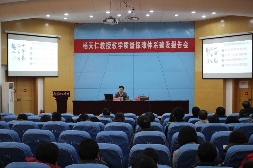 杨教授为我校师生做了两场精彩讲座,其中,“高校内部与外部相统一的质量保障体系建设”,由张世海副校长主持; “标准化教研室内涵建设与发展”,由张伟副校长主持。分管校领导、各学院(部) 院长、主管教学副院长、教务科研办主任、教研室主任、党政办、发展规划处、人事处、教务处、设备处、科研处、教学质量监控与评估处、财务处、国有资产管理处、组织部、学生处、招生就业处等行政处室副科级以上干部、校教学督导组成员、张仲景国医国药学院全体教师及学生代表聆听了讲座。杨教授从质量保障体系建设的政策,理论依据,因素汇总,内部外部要素与对接,管理系统,建设原则等几个方面详细讲解了高校教学保障体系建设;深入分析与讲解了教研室功能发展、必要性、原则及建设内涵,高校专业认证和审核评估等内容。