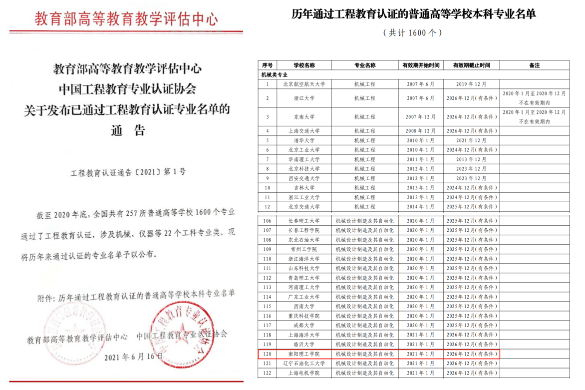 2017年6月,学校印发《南阳理工学院工程教育专业认证工作实施方案》(南理工字〔2017〕62 号),全面启动工程教育专业认证工作。2018年10月,机械设计制造及其自动化专业向中国工程教育专业认证协会提交了认证申请报告并被受理;2019年7月,提交了《工程教育认证自评报告》,并顺利通过审查;2020年10月,接受了中国工程教育认证协会专家组进校现场考查认证。机械设计制造及其自动化专业是我校第一个通过工程教育认证的专业,是继中医学专业认证之后我校在专业认证工作中实现的又一个新突破。