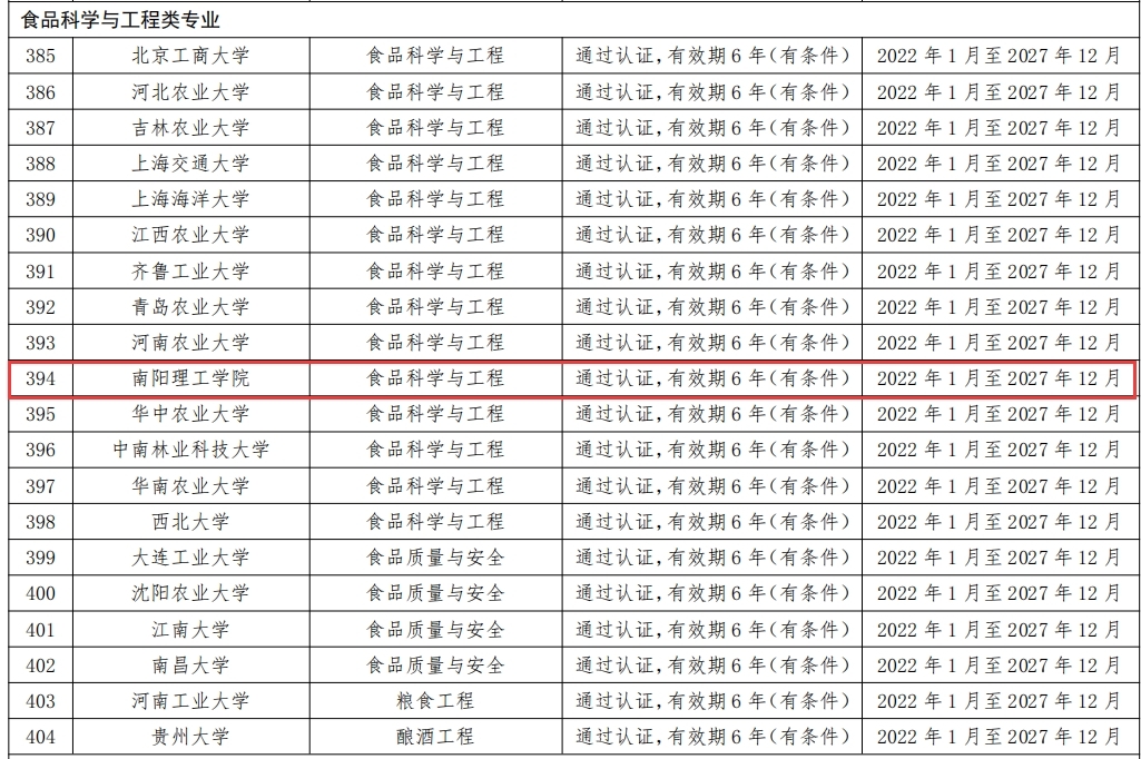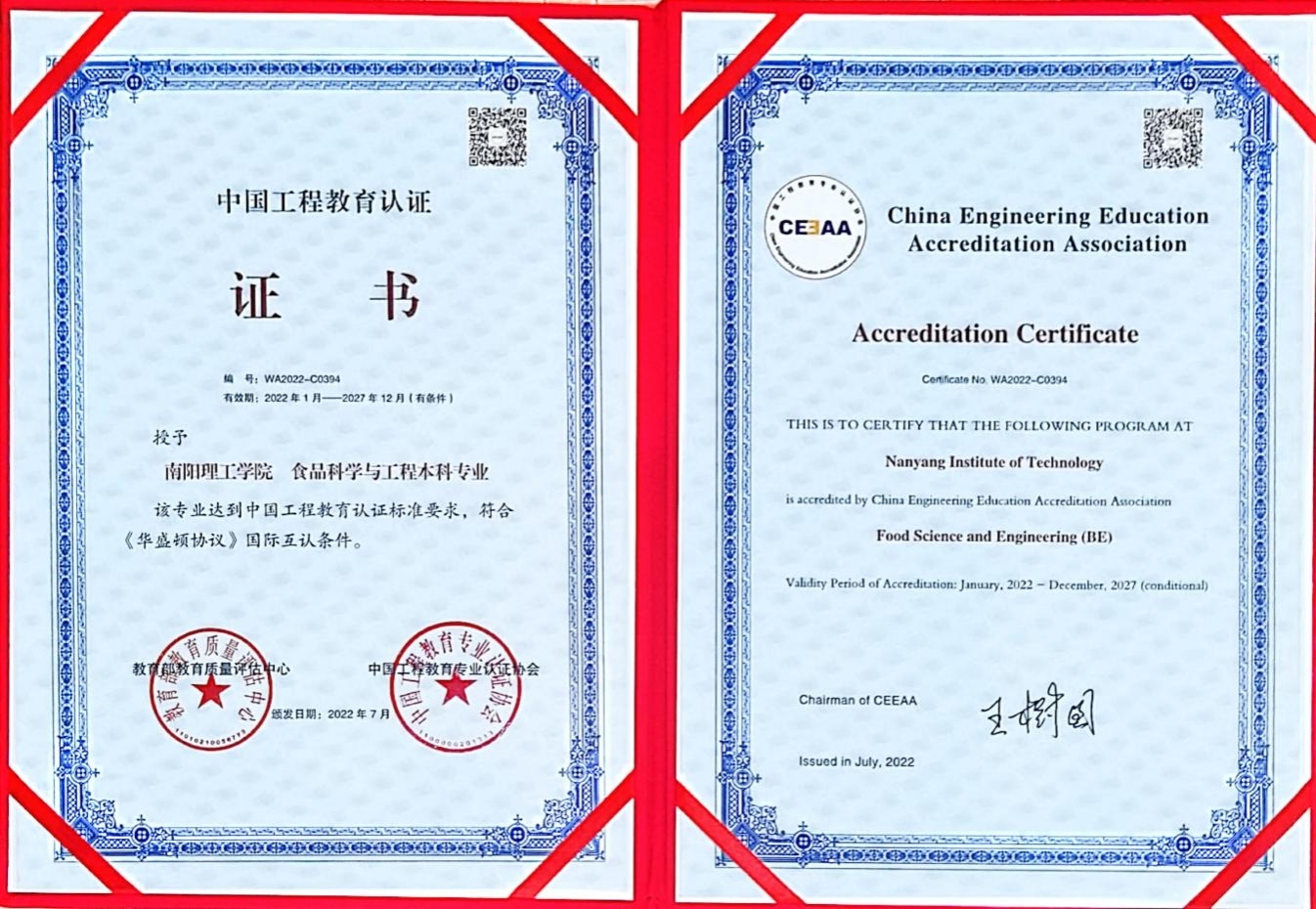 本网讯(记者/张燕 )近日,教育部教育质量评估中心、中国工程教育专业认证协会分别公布了2021年工程教育专业认证结果(工认协【2022】21号)。南阳理工学院食品科学与工程专业经过向协会提出认证申请、通过认证自评报告审核,完成专家组线上考查、结论审议等多个环节,最终顺利通过本次认证,有效期6年(2022年1月至2027年12月)。
